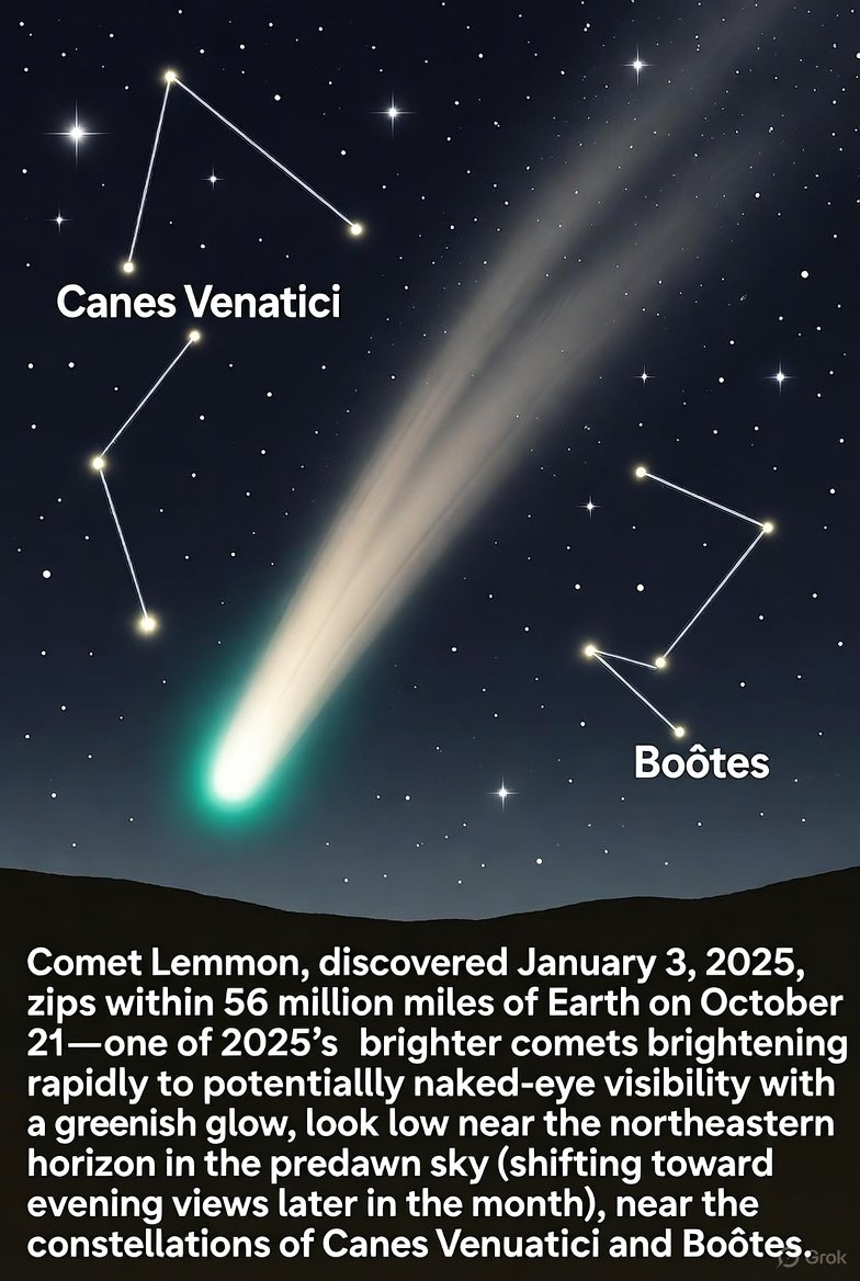 - Comet Lemmon: Brightening rapidly and potentially visible with the naked eye by late October, it will be positioned low near the northeastern horizon in the predawn sky (shifting toward evening views later in the month). Its orbital trip around the sun takes about 1,300 years, so catching it now is a real cosmic jackpot.